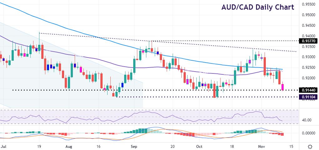 Bears again tested the 0.91 zone in October before rebounding. But the double bottom trigger looks to have failed with prices falling late last month from 0.9337. The pair recently consolidated below 0.9250 around the 50-day and 100-day SMAs.