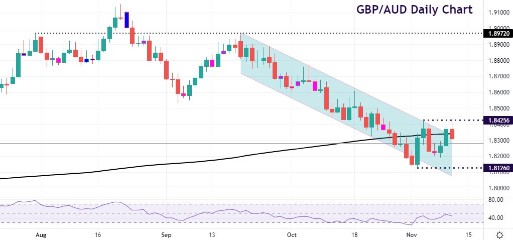 This pair has been in a bearish descending channel since September. A series of lower highs and lower lows saw prices make a cycle bottom at 1.8126 at the start of this month.