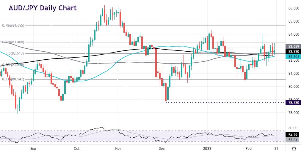 Prices are currently trading around and being supported by the three main long-term (50,100 and 200-day) SMAs at 82.30, 82.68 and 82.32. The midpoint of the October to December move also sits in here at 82.51. Bulls will want to break above this week’s high at 83.33 in order to head towards last week’s spike high at 83.98 and then this year’s high at 84.30.