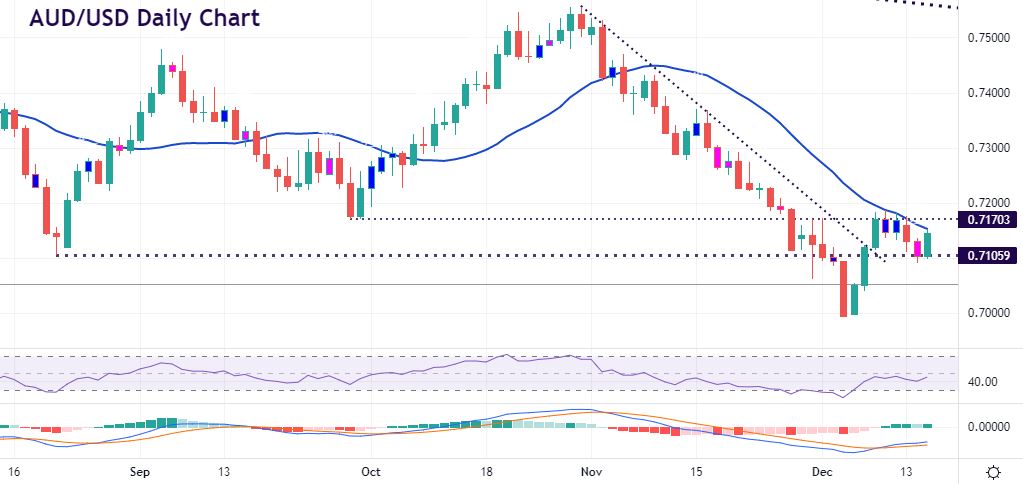 Prices have retraced again breaking trendline resistance from the October top. The August trough is offering support at 0.7105 but the September low at 0.7170 has acted as resistance on several occasions very recently. The 21-day SMA is also acting as near-term resistance. The Fed meeting will decide which level we break first.