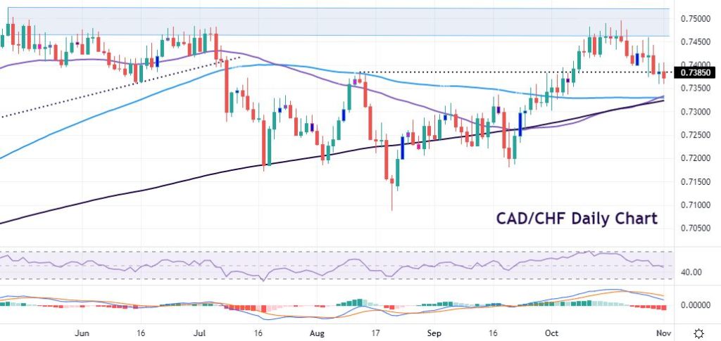 After topping out most recently at 0.7495 in October, prices have fallen back. Today has also seen the August high at 0.7385 cap any buying momentum. The daily RSI has just dipped below the 50 mark and the MACD is picking up.