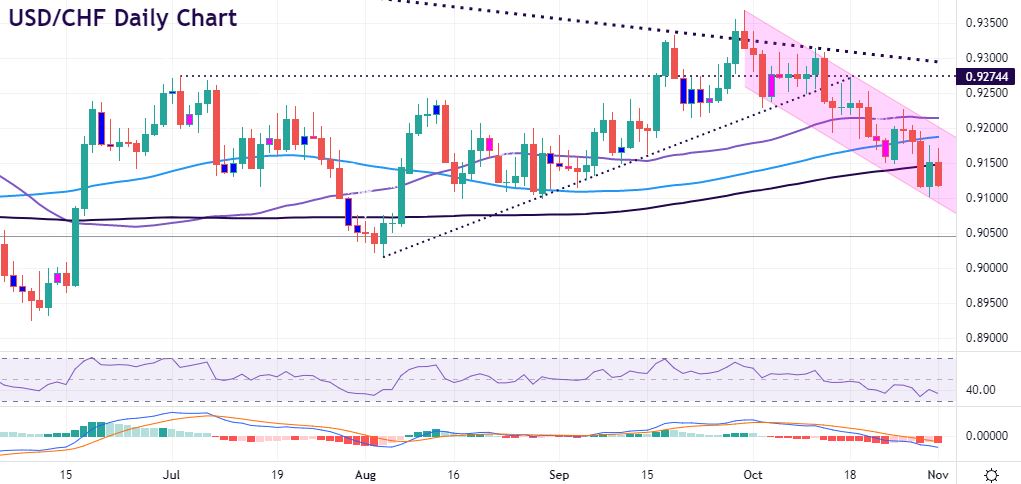From here, prices broke the near-term down trendline at 0.9250 and through both the 50-day and 100-day SMAs at 0.9215 and 0.9188 respectively. The bearish channel has continued with the major dropping to a swing low at 0.9102 at the end of last week. That marked the fifth straight week of losses.