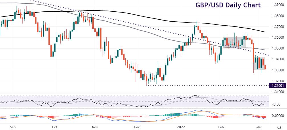 The 200-day SMA saw the major top out at 1.3748 in mid-January. Prices did consolidate above long-term trendline support into February. But the Russian offensive saw a flight to quality and the dollar. The pair plunged through the 100-day SMA at 1.3483 and that trendline which now turns into resistance.