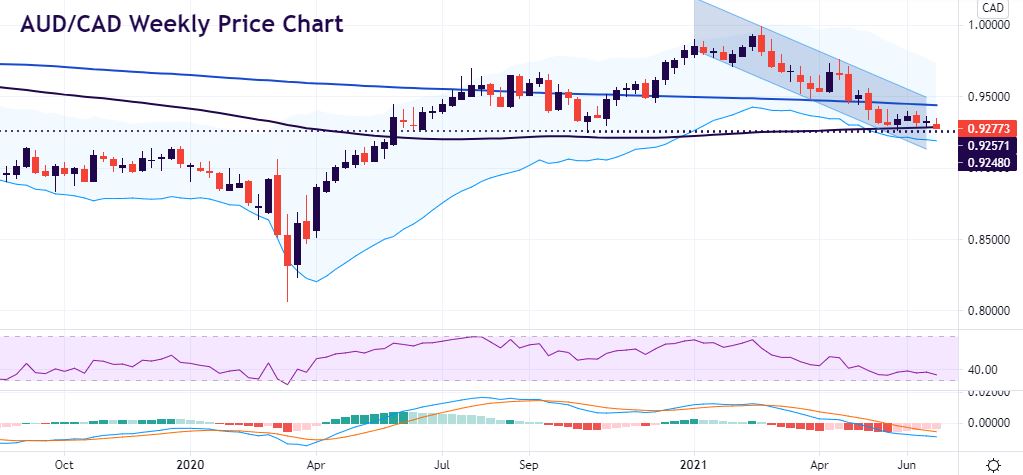 We can clearly see the downtrend channel that AUD/CAD has been in this year after topping out at 0.9993 during the last week of February. Having broken down through the 200-week SMA, that indicator now acts as strong resistance above around 0.94. The pair currently sits on the 100-week SMA in a prominent area of support which also encompasses the October 2020 low and the spike low from December 2018.