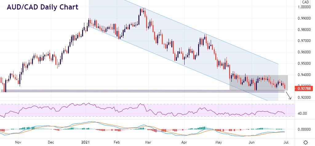 We wrote about NZD/CAD yesterday and how bearish momentum could see a break through recent lows. AUD/CAD is in a similar position as it too is now approaching a key support zone.