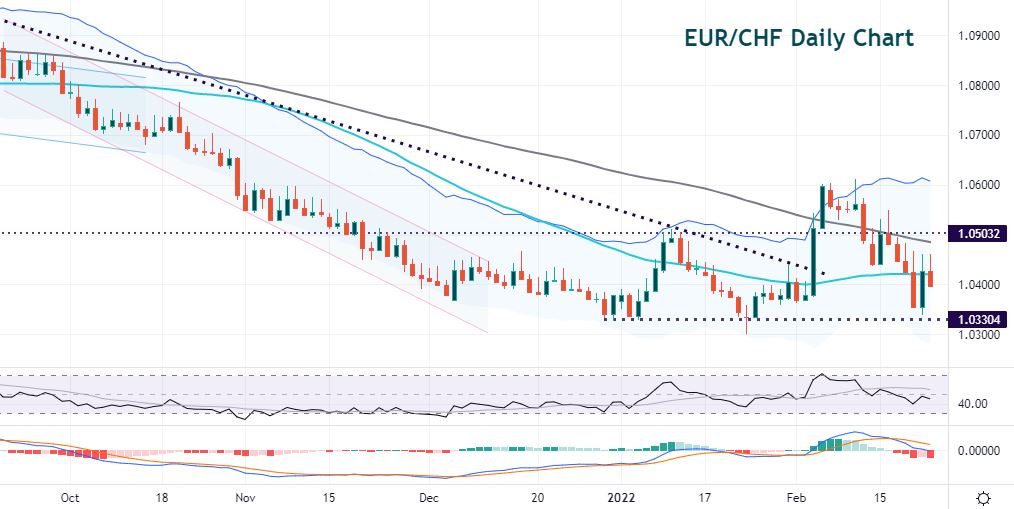 EUR/CHF has become something of a risk sentiment gauge in Europe due to its high exposure to the Russia-Ukraine crisis. The market is trying to understand the ongoing impact of the Russian escalation as the West “keeps it powder” in terms of stronger sanctions. The swissie is a go-to safe haven currency and the euro suffers if a full-scale Russian invasion occurs, as it will impact hugely on the eurozone economic recovery.