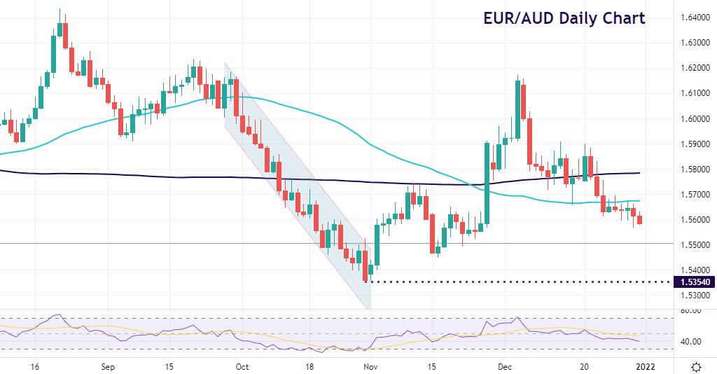 The emergence of Omicron saw a strong bid and prices rebounded to a spike high at 1.6170. Overbought conditions in the RSI then eased. Most recently, the pair has tracked sideways after breaking below the 200-day SMA at 1.5785. We are now trading under the 50-day SMA at 1.5675 which acts as resistance. With the RSI pointing lower, bears will target at Fib level at 1.5506 and then the cycle low at 1.5354.