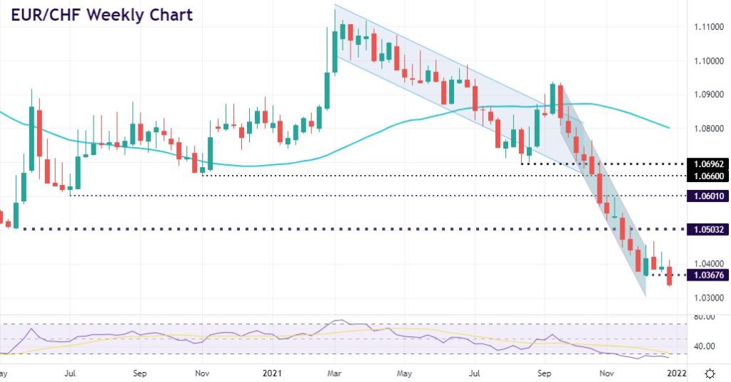 EUR/CHF is often subject to SNB intervention. This has historically meant the central bank tries to curb CHF appreciation by buying the pair. But the many “lines in the sand” over the past several months which the SNB supposedly set have not really come to pass. One European bank has dubbed the franc “the quintessential risk hedge to European risk”, which has certainly made it appealing when you consider the Omicron infection rates and restrictions in activity.