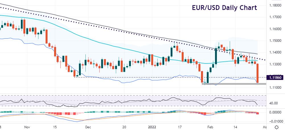 EUR/USD is experiencing its largest one-day decline since March 2020. Its February recovery at the start of the month from below 1.12 to the January high close at 1.1482 is now a distant memory. Prices failed at that resistance level, trading around the 100-day SMA for a while. This indicator has now fallen to 1.1396 and represents resistance above.