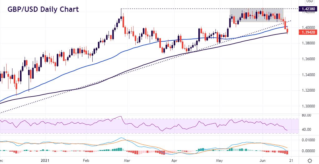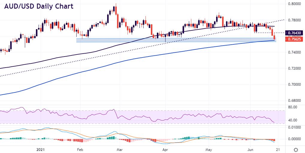 Today’s stellar aussie jobs data halted the Fed selloff briefly as the market eyes up the next RBA meeting on 9 July after Governor Lowe’s broadly upbeat speech overnight.  The pair is now supported by a zone of medium-term support around the 0.7570/30 area with the 200-day SMA residing just below here at 0.7550. Initial post-FOMC reaction in FX has reversed in recent times, though last night’s meeting does seem as though it is the start of a slow process in policy adjustment. Any countertrend move will need to take out the early June lows around 0.7643 to confirm that bearish momentum has subsided after yesterday’s range breakout.