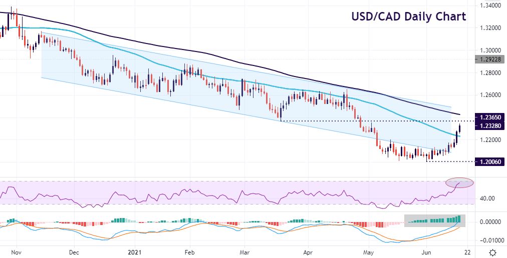 While CAD fundamentals remain very solid, with recent high inflation data adding to the mix, USD/CAD squeezed higher last night through the 50-day SMA and onto a peak of 1.2346 made earlier in today’s session. This is not far off resistance at the mid-March low of 1.2365 with the next level above being the 100-day SMA at 1.2420. The pair is currently trading around the 50% retrace of the April/May fall and the RSI is nearing 70 which points to being overbought, at least in the near-term. Support sits at the 50-day SMA at 1.2235 so this area could be an opportunity to load up longs for another push higher to the mid-March low.
