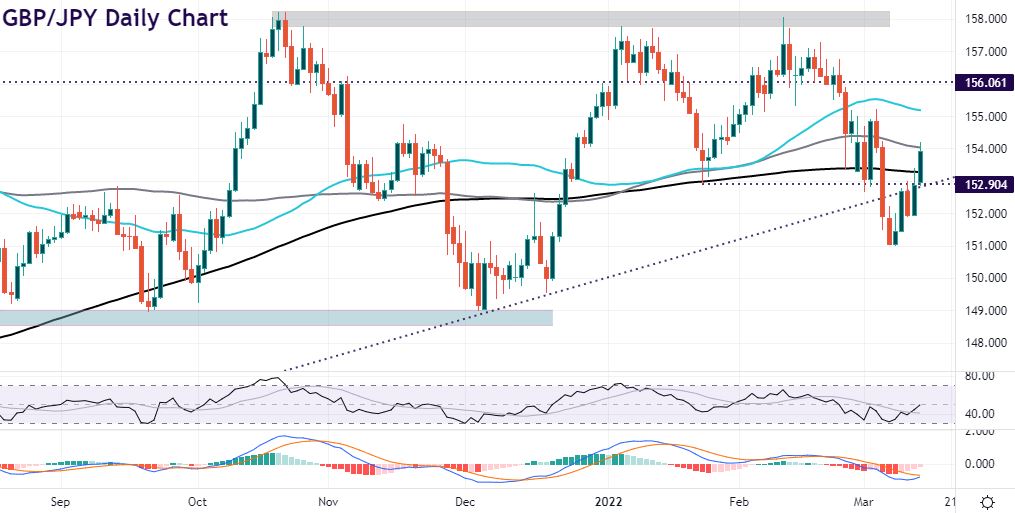 The geopolitical crisis in Ukraine pushed the pair sharply lower from late last month. Prices dropped below near-term support at the January low at 152.90. Sellers then pushed below long-term trendline support.