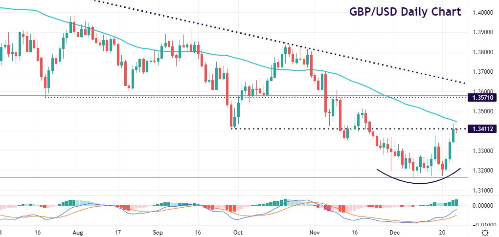 A close above the September low at 1.3411 is important for more upside. So too above the 50-day SMA at 1.3448 which would be the first time since late October. The dollar traditionally struggles to find a bid at this time of the year. It also seems that markets are already fully pricing in the feasible maximum number of BoE hikes for next year.
