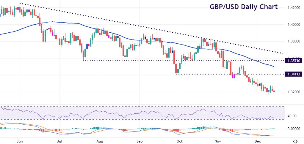 The bearish trend in GBP/USD since June that accelerated in late October continues. Support was seen around the September low at 1.3411, but prices have moved down over the past few weeks.
