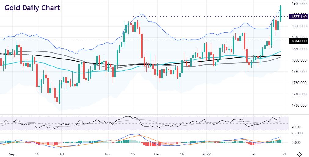 The daily RSI is nearing overbought territory and prices are touching the upper Keltner band, with the MACD momentum indicator firmly in the green. Some consolidation above $1877 should see buyers aim for the next major resistance into $1915 where the market topped into last spring. This is also near the major retracement (61.8%) of the selloff from the 2020 highs of 2075. Any more peaceful headlines may see a quick retracement with $1834 next major support.