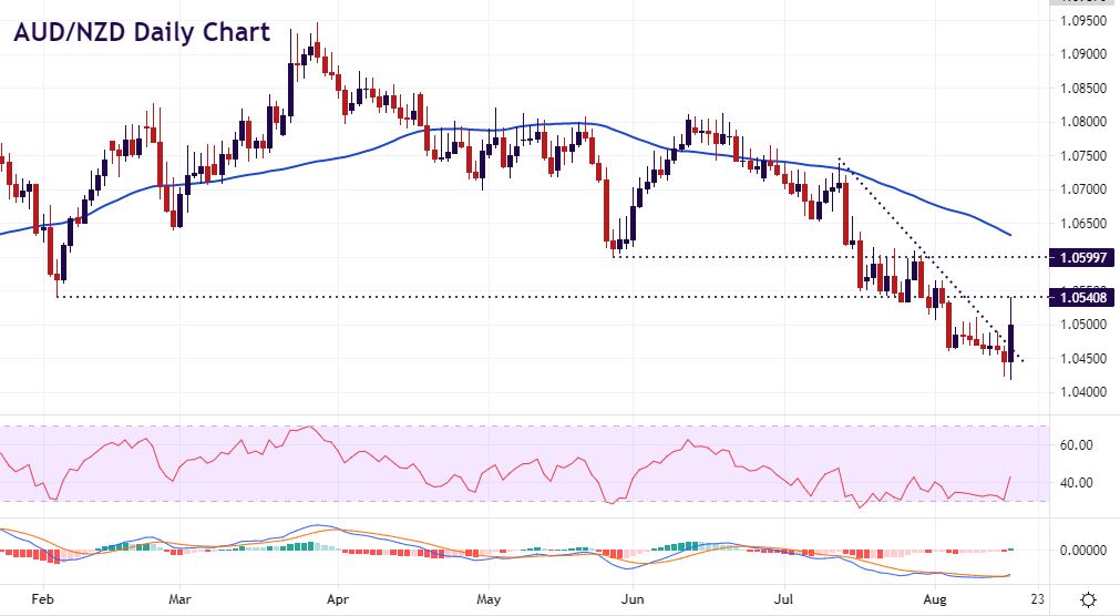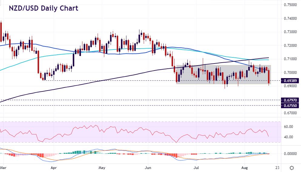 The kiwi was down close to 1.7% earlier today with some economists now believing the RBNZ will leave rates on hold tomorrow. NZD/USD had been trading towards the top of the recent range above 0.70, even as the dollar found a small bid this week on the Delta variant spread and slowing Asia-Pacific growth expectations. But the pair had failed to break higher above the 50-day SMA towards the 200-day SMA at 0.7110 which means prices are still vulnerable while trading below this resistance.