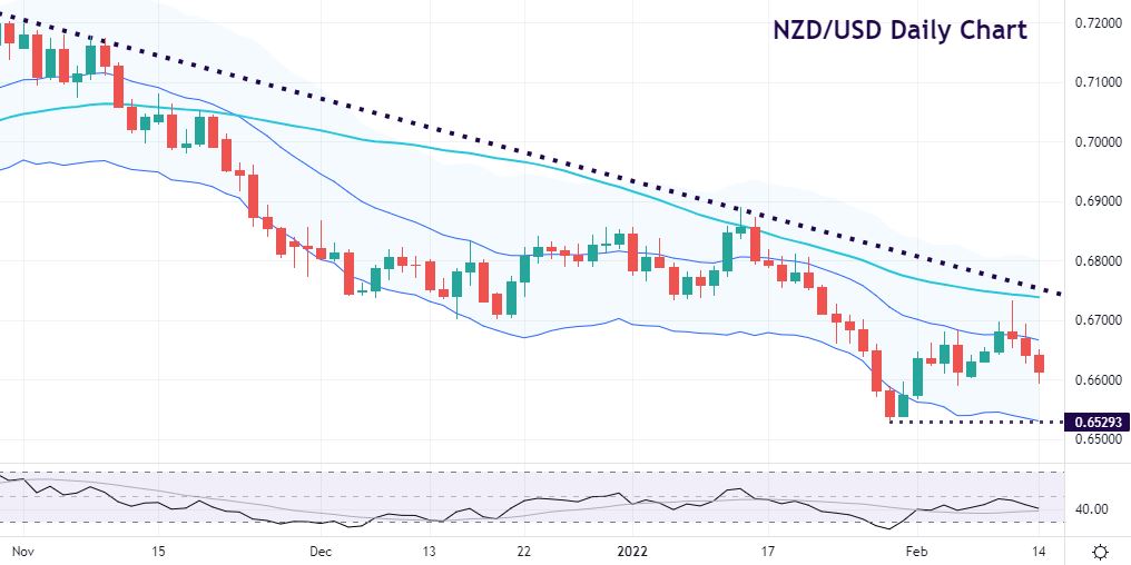 But the reversal candlestick on Thursday warned the bounce would fail and prices have rolled over, touching 0.66 today. Bears will target the pivot low and then long-term lows at 0.6424/32. Of course, if the Ukraine concerns do settle, buyers will want to stabilise above the 21-day SMA before looking to break trendline resistance and the 50-day SMA at 0.6738.
