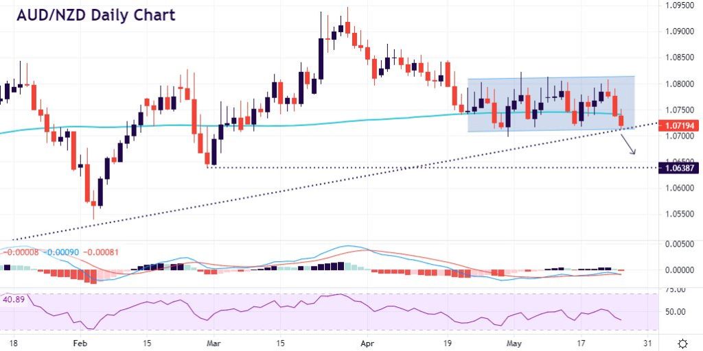 AUD/NZD also has a similar long-term trendline in play from the March lows of last year. The pair has been trading in a range over the last few weeks and is currently trading just above the trendline which is also on additional support just above 1.07 The bears have tried numerous times to break this 1.07 zone going back to the end of last month and the RSI and MACD have both turned south again. April lows at 1.0699 will be the last support but there is not much after this in the near-term until the February lows around 1.0640. The bar is high for the RBNZ to be overly dovish, but if this is the case, then the antipodean cross will bounce off 1.07 support once more and back in its range toward 1.08.