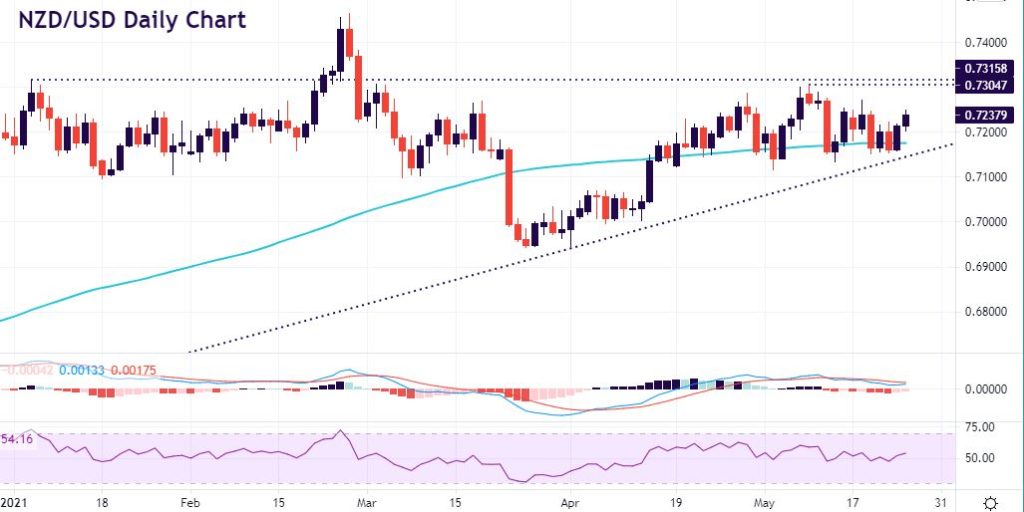 The trendline from the pandemic lows has held prices well this year with the dip below 0.70 to the year-to-date lows at 0.6943 in March being well supported by buyers. The pair looks to have bounced off this bullish trendline once again, with the 100-day moving average also acting as good support. Any bullish hints by the RBNZ would see the pair move higher and see prices push up towards 0.73 and the May highs at 0.7304 and January highs at 0.7315. The RSI has moved above 50 pointing to a pick-up in bullish momentum, having moved around this key level over the last few weeks. Of course, dollar weakness is a key driver in this pair so the possible (false) break in DXY is something to keep an eye on.