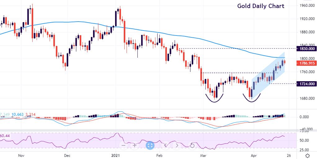 If caution continues, then we may see the target for the double bottom reversal pattern seen in March and this month, which is around $1830 (the height of the pattern added to the breakout point). Ahead of that, bulls will have to battle with the psychological $1800 level plus the 100-day moving average just above here. Long term funds are short or neutral currently and a move back below last week’s low at $1724 will be needed to see bearish momentum resume.