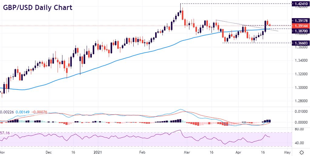 GBP has seen a bout of economic figures released this week with the jobs market still very much supported by the furlough support scheme with unemployment even dipping, while today’s inflation numbers bounced back and are set to rise above 2% later in the year.