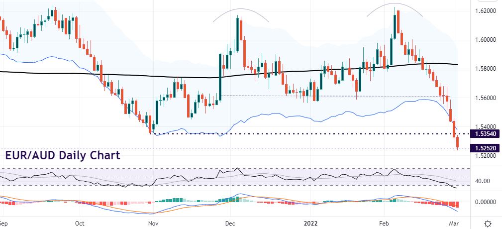 The aussie has been well insulated from the conflict in Europe, even as risk sentiment has tumbled. Of course, AUD is a commodity-linked currency so is enjoying considerable fundamental support from soaring energy and agricultural prices. Australia is one of the top six global wheat exporters and the world’s leading LNG exporter.