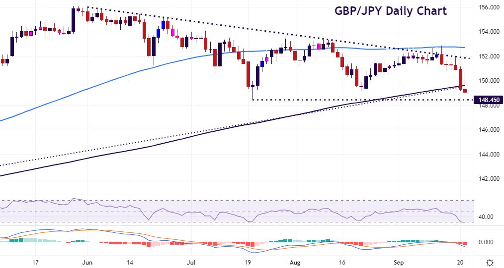 Prices hit support around the August and April lows in a zone just above 149. The move above 150 earlier today has been rebuffed and the pair is now heading for the pivot July spike low at 148.45. The well-watched 200-day SMA sits at 149.62. There is also a long-term trendline from the pandemic crisis lows here. The daily RSI is touching 25 so oversold. But if bears can consolidate down here, then targets to the downside come in at 147.95 and below.
