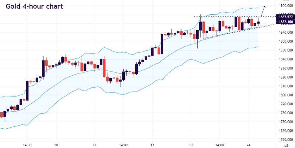 Switching to a much shorter timeframe, we can see the bullish momentum playing out on the four-hour chart. An ascending triangle pattern looks to be forming which is a continuation pattern, so often bullish in an uptrend. The base is a series of rising lows while the highs have formed at the top line. A solid break of the highs around $1887 should see prices push towards the $1900 mark.