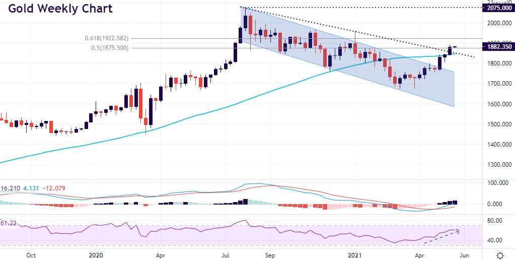 Stepping back and looking at the weekly chart, we can see that the descending price channel formed since the July peak was broken at the start of May with gold bugs pushing prices above the 50-month SMA. Last week’s price action then advanced through the sloping trendline from the $2075 top and the 50% retrace level of the July to April correction at $1875. Bullish momentum remains strong on this longer-term timeframe so if we can hold up here, then the target comes in at the next Fib level retracement at $1922. Support lies at the 50-week SMA around $1850.