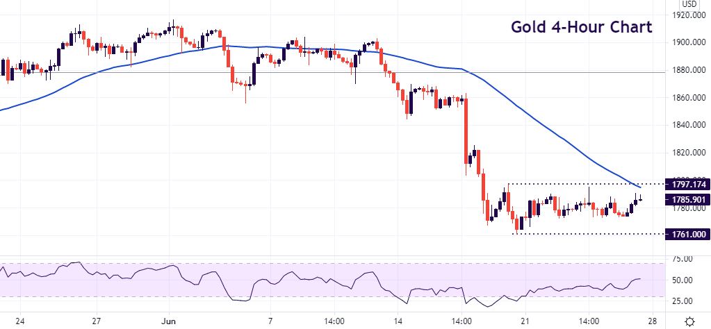 Gold has consolidated this week just above the recent lows after selling off dramatically on the hawkish Fed last week. There has been little positive reaction to the recent chorus of Fed speakers, similar to the dollar which is a key driver of the yellow metal holding its gains. Powell’s more cautious testimony on Tuesday failed to excite gold bugs which indicates potential further weakness, especially as more risky assets are shining.