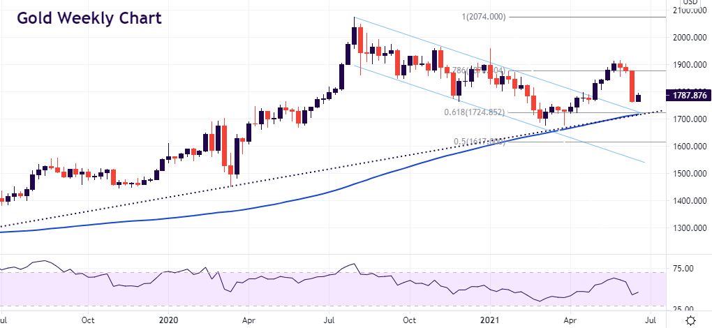 The longer-term weekly chart shows the breakout of the descending bear channel at the beginning of May and then the failure of prices above $1900 at the end of last month. With bearish momentum so strong after last week’s sell off, it seems the direction of travel is lower into a confluence of support around $1724. This zone includes the long-term trendline from the May 2019 lows, the 100-week SMA and a prominent Fib level. Much depends on the dollar and “transitory” inflation, but if the bears break this week’s and last week’s low around $1760, a move south looks inevitable. A break of the lower support zone would then target $1617. On the flip side, a bout of risk-off is needed to attract the bulls with $1878 the next minor Fib level above.