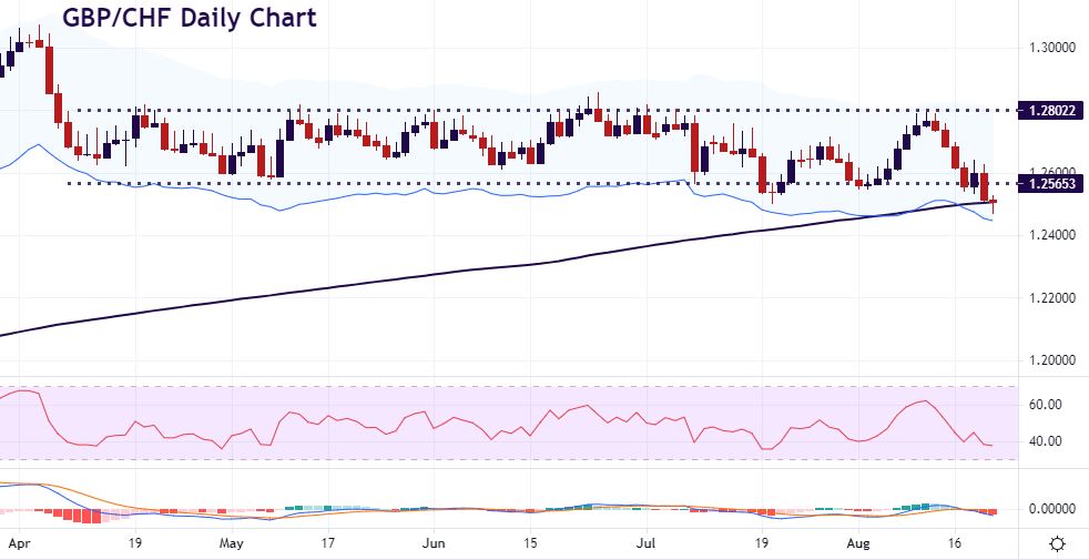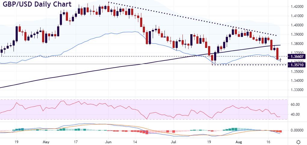 We wrote at the start of the week how cable was struggling to move higher with the falling trendline from June repelling prices on numerous occasions. Four days of declines in five means GBP/USD is now nearing a test of 1.36 and major support at the July low of 1.3571. There is also a retracement point of its losses between March 2020 and June 2021 at 1.3579.