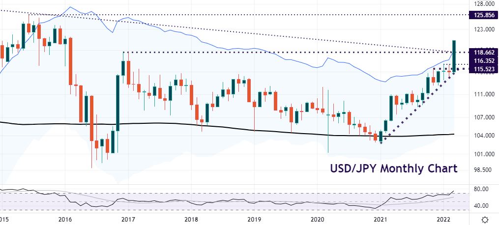 That long-term top also tallied with wider trendline resistance. Bulls will have eyes on the 2015 peak at 125.85. Near-term resistance is 121.48 and 122.02.