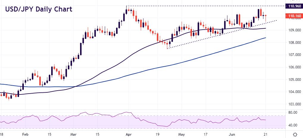 The upward trendline from the April lows is proving good support with USD/JPY making a series of higher highs and higher lows in a shallow bullish channel. Last week’s high didn’t quite make the year-to-date top at 110.96. That said, buyers have stepped in today with 10-year US yields off their lows as the pair neared the upward trendline and are endeavouring to break above the early June highs. Bullish momentum has stabilised but is still above 50 on the daily RSI which potentially points to another attempt at 110.82, last week’s high. Support sits at the upward trendline mark at 109.64 with the 50-day SMA at 109.15.